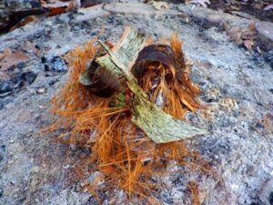 Kindling: dry, toothpick-sized twigs to finger-thick branches that catch fire easily and provide initial sustenance for flames.