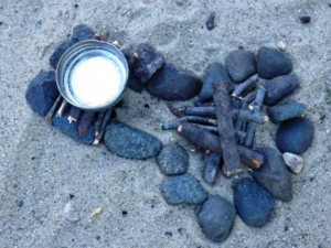 - Set up a small Teepee fire in the center of fire spot, using kindling.