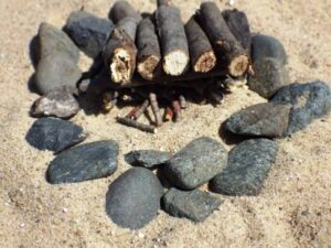 Use: Dry, thin twigs for kindling, 5-6 pieces of large firewood, matches or fire starter